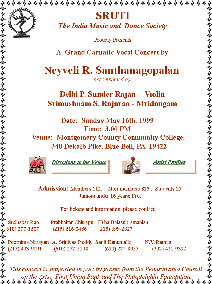 More about the music presented by Sruti World Music : Carnatic | Hindustani For more information, send email sruti@sruti.org Visitors Since October 31, 1999: Last Updated: 02/14/01 : Comments? Designed and Developed by K. P